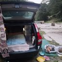 A nice place in a secluded spot by a stream for sleeping under a tent or under a tent, in a car just off the road that tourists take to the castle.